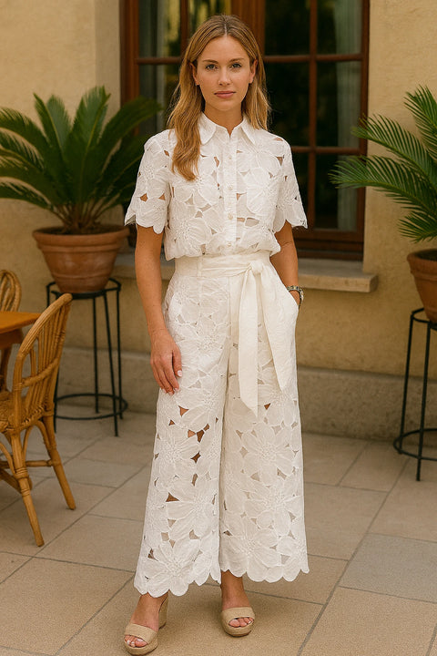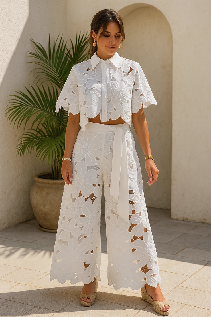 Este conjunto de dos piezas en ojalillo presenta una estética fresca y sofisticada. El crop top sin mangas. con cuello redondo y bordado perforado. ap..